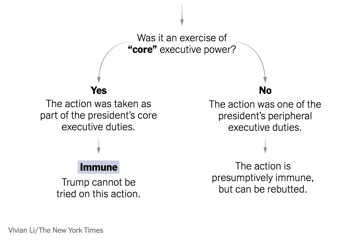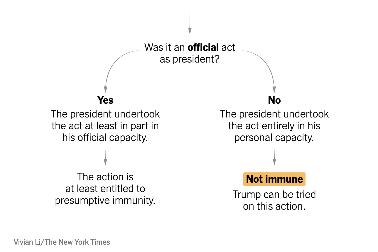 Under the Supreme Court’s new doctrine, “official” actions by Mr. Trump would fall into one of two categories. Some official acts are core to the president’s exercise of executive power, in which case they are absolutely immune and no information about them can be used in his prosecution. Other official acts are more peripheral, in which case prosecutors might still be able to use information about them in court, depending on the circumstances.