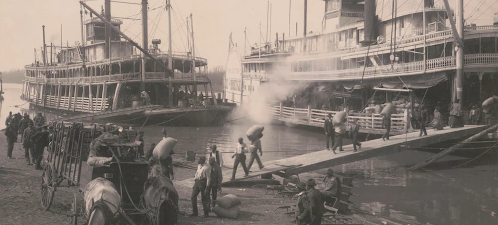 African American men transferring cargo from a horse-drawn wagon to the Belle of the Bends steamboat on the Mississippi River in Memphis; the Belle of Calhoun is docked behind it, circa 1906. (photo: Library of Congress)