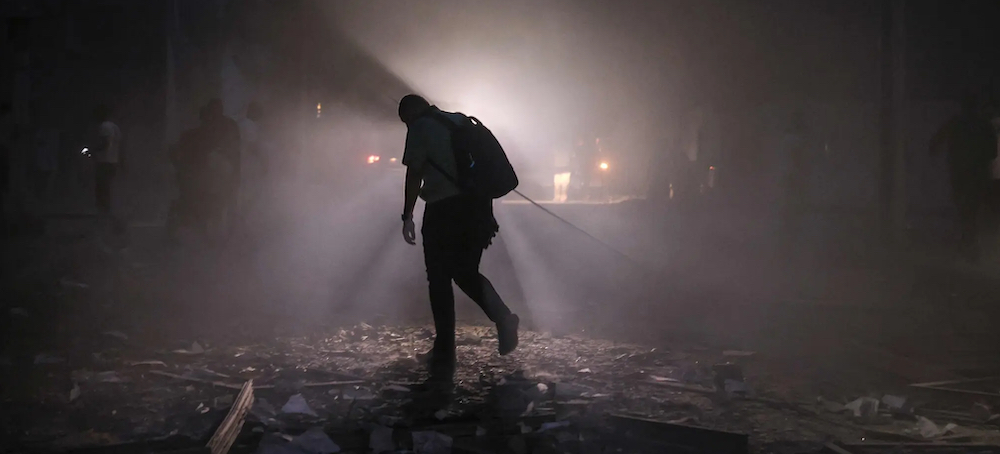 A man finds his way along a debris-strewn street at night following Israeli airstrikes in Gaza. (photo: Mohammed Abed/AFP)