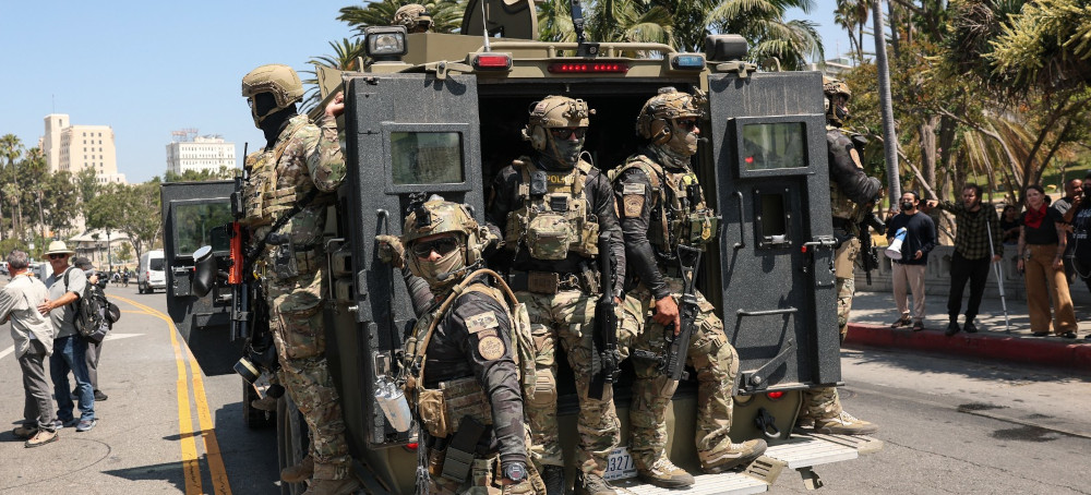 Federal agents with US Customs and Border Patrol (CBP) ride on an armored vehicle driving slowly down Wilshire Boulevard near MacArthur Park in Los Angeles, California, on July 7, 2025. (photo: AFP) American Democracy Is Crashing Out and It Will Be Hard to Reverse, International Rights Group Warns