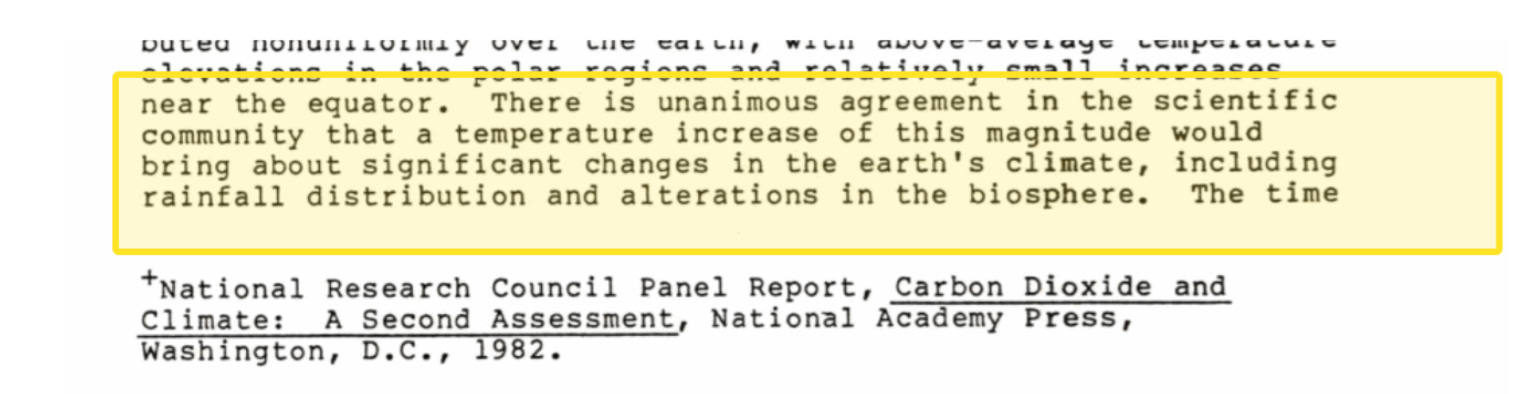 - September 1982: Exxon scientist tells top executives there is “unanimous agreement” about weather shifts. A memo from one of Exxon’s top scientists to Exxon management read: “There is unanimous agreement in the scientific community that a temperature increase of this magnitude would bring about significant changes in the earth’s climate, including rainfall distribution and alterations in the biosphere.” The scientist concluded that despite the connection between “Exxon’s major business” and “the increase of atmospheric CO2,” it is Exxon’s “ethical responsibility” to publish its research (the results were later published in scientific journals).