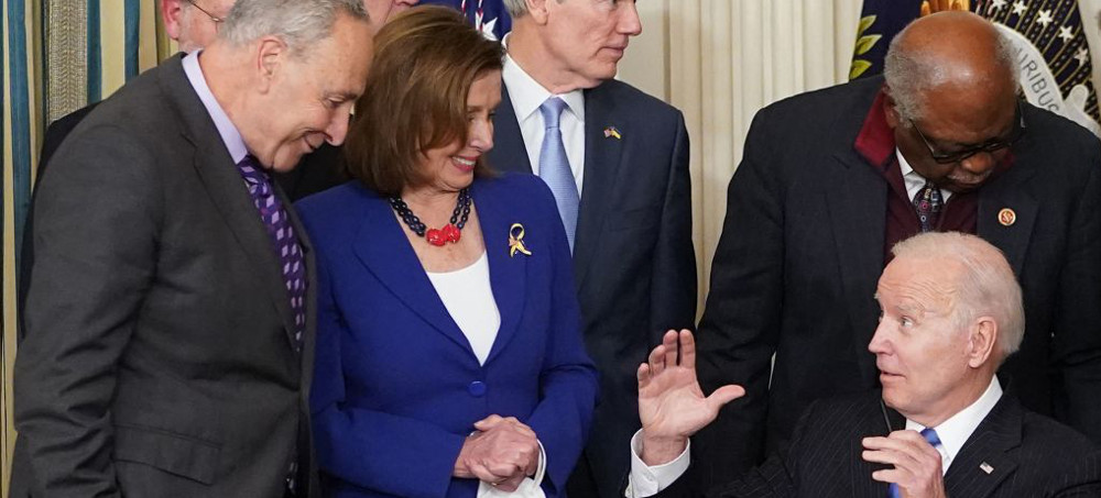 President Joe Biden speaks to Senate majority leader Chuck Schumer and House Speaker Nancy Pelosi during a signing ceremony for HR 3076, the Postal Service Reform Act of 2022. (photo: Mandel Ngan/Getty)