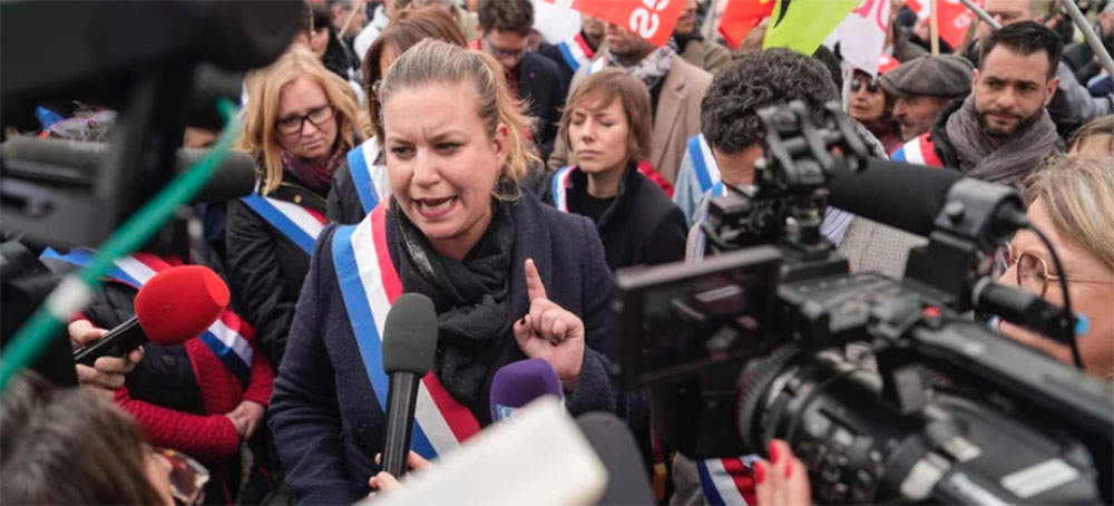 Lawmaker and far-left group leader Mathilde Panot gestures as she speaks to the media Monday during a protest against the retirement bill in Paris. (photo: Lewis Joly/AP)
