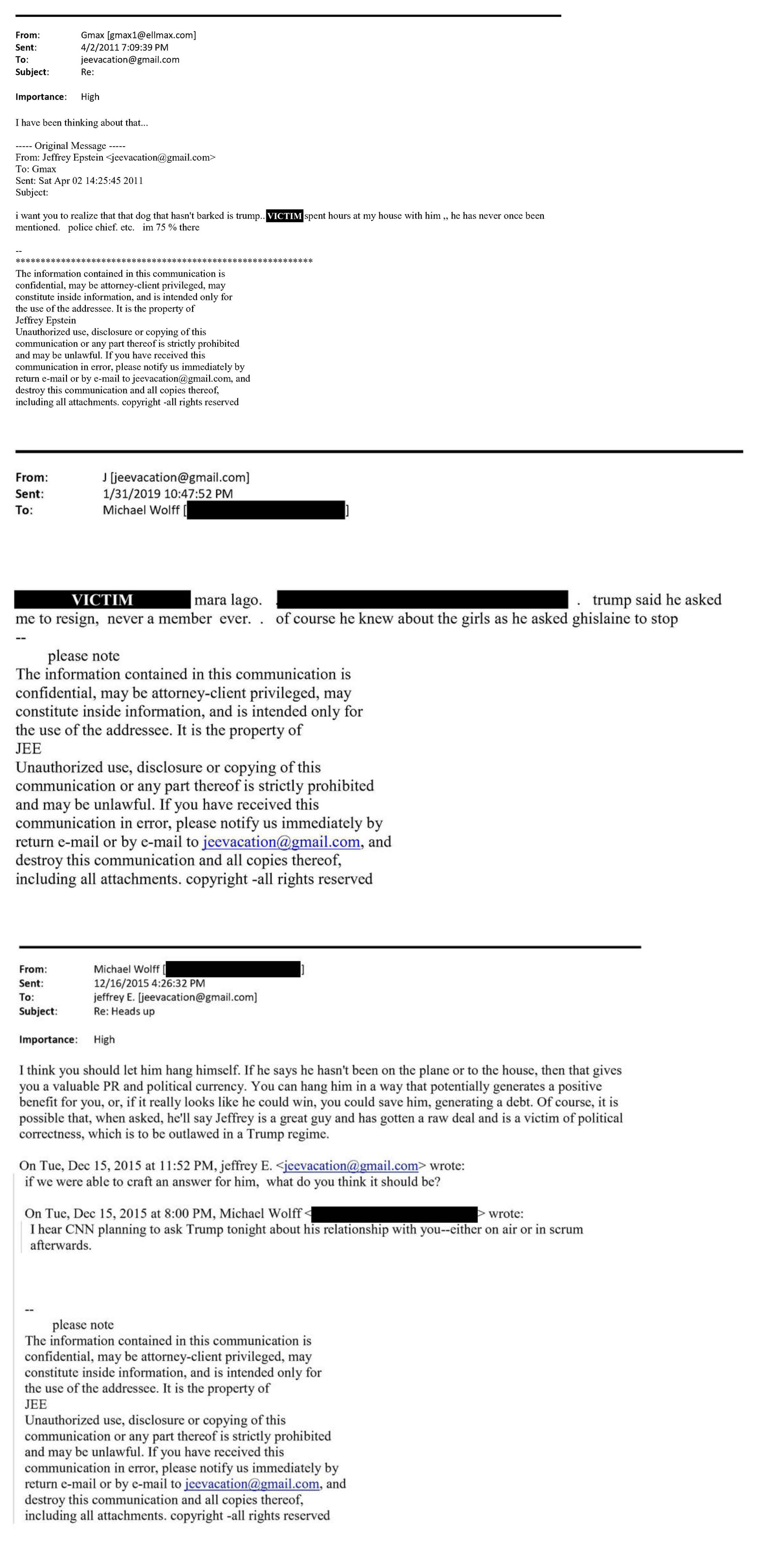 In one email from April 2011, Mr. Epstein told Ms. Maxwell, who was later convicted on charges related to facilitating his crimes, “I want you to realize that that dog that hasn’t barked is Trump.” He added that an unnamed victim “spent hours at my house with him ,, he has never once been mentioned.”