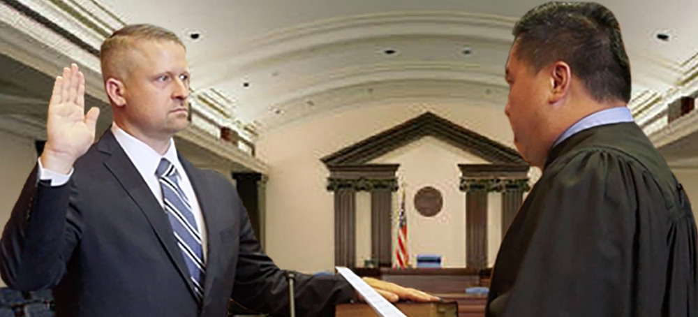 Judge James C. Ho of the U.S. Court of Appeals for the Fifth Circuit swears in Matthew Kacsmaryk as a judge to the U.S. District Court for the Northern District of Texas, July 2019. (photo: First Library)