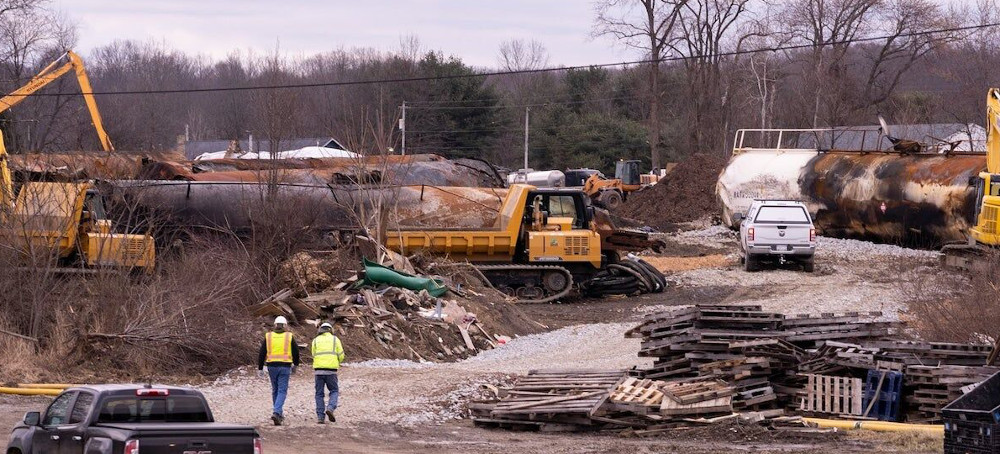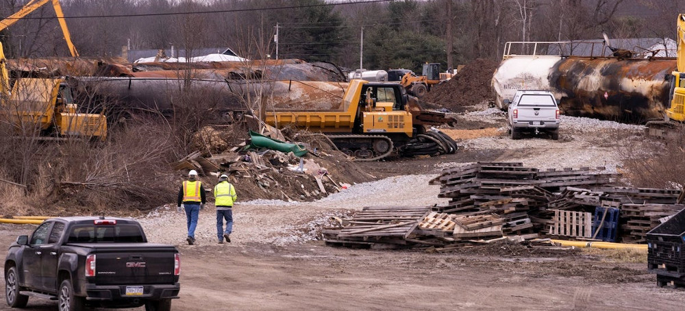 Ohio EPA and other cleanup crews work at the Norfolk Southern train derailment site in East Palestine, Ohio, on Feb. 24, 2023. (photo: Joe Timmerman)