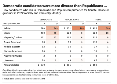 Unsurprisingly, as has been the case for decades, Democrats had a more diverse candidate pool. At least 46 percent of their candidates this cycle were people of color, as opposed to only 19 percent of Republican candidates. But, in 2022 — possibly because white candidates were more likely to have advantages like incumbency and fundraising, possibly because of racism on the part of voters, possibly for other reasons — candidates of color from both parties had a harder time winning their primaries. As a result, when we mapped Fraga and Rendleman’s data onto the primary results, we found that people of color will constitute just 39 percent of Democratic general-election candidates and 16 percent of Republican general-election candidates.
