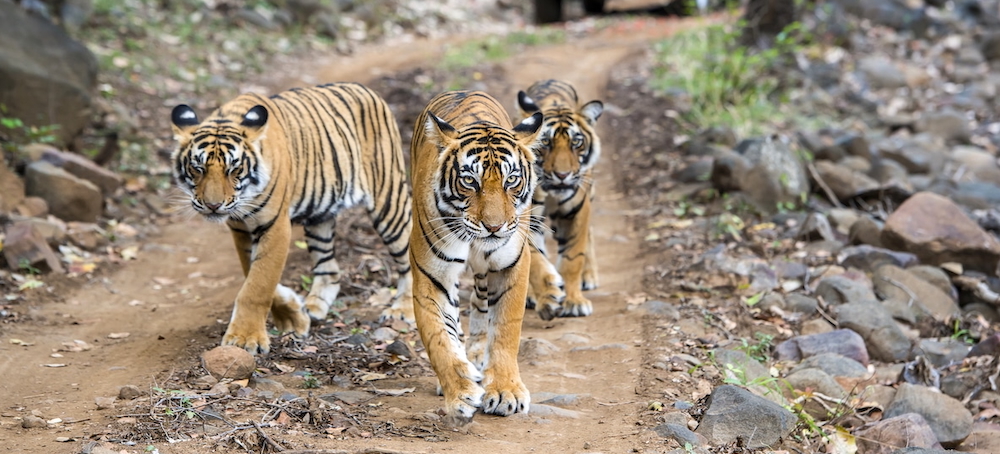 A tigress and her juvenile cubs walk on a road in the jungle in Ranthambore National Park in Rajasthan, India. (photo: guenterguni/E+/Getty Images)
