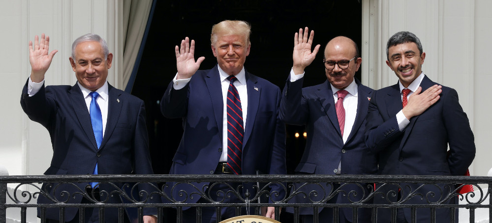 Israeli Prime Minister Benjamin Netanyahu, U.S. President Donald Trump, Bahraini Minister of Foreign Affairs Abdullatif bin Rashid Al Zayani, and United Arab Emirates Minister of Foreign Affairs Abdullah bin Zayed Al Nahyan after the signing ceremony of the Abraham Accords on Sept. 15, 2020, in Washington, D.C. (photo: Alex Wong/Getty)