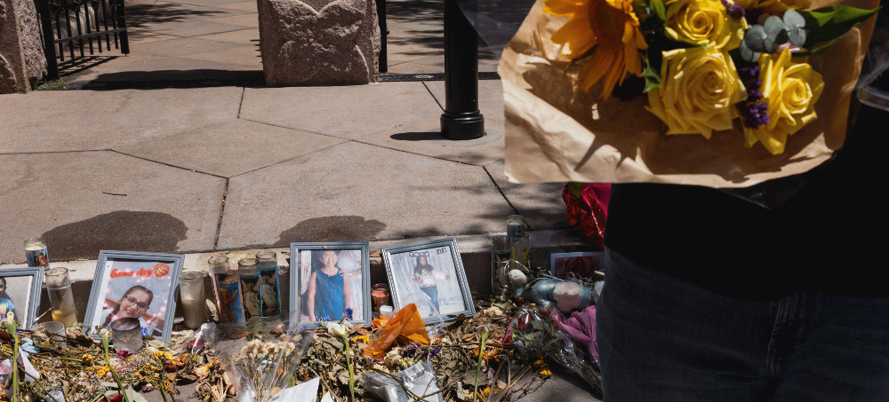 A memorial for the victims of the mass shooting at Robb Elementary School in Uvalde, Texas, is seen in Austin on May 31. (photo: Jordan Vonderhaar/Bloomberg)