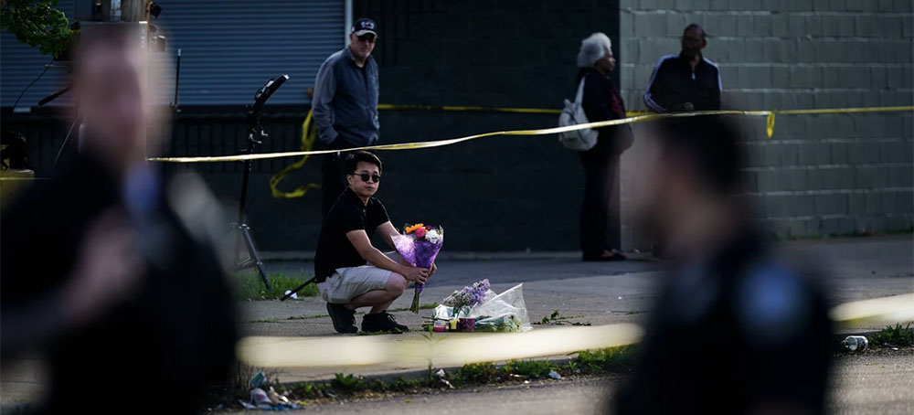 A person places flowers outside the scene of the mass shooting at a supermarket in Buffalo, N.Y., on Sunday. (photo: Matt Rourke/AP)