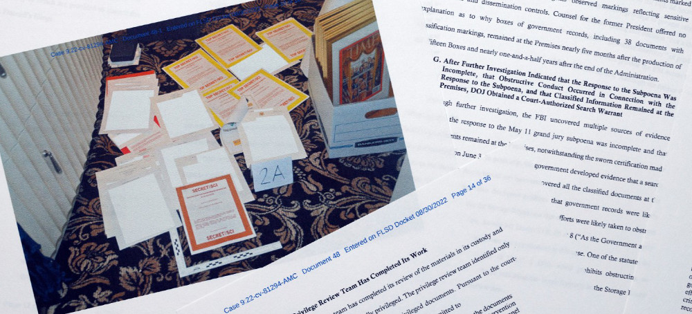 Pages from a Department of Justice court filing last month in response to a request from Donald Trump's legal team for a special master to review seized documents. (photo: Jon Elswick/AP)