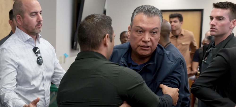 Sen. Alex Padilla is removed from the room after interrupting a news conference with Department of Homeland Security Secretary Kristi Noem at the Wilshire Federal Building on Thursday. (photo: Luke Johnson /LA Times)