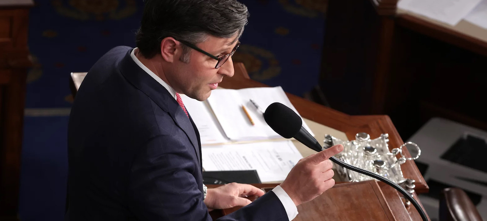 House Speaker Mike Johnson, R-La., delivers remarks at the U.S. Capitol. (photo: Alex Wong/Getty Images)
