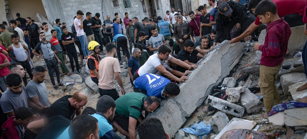 Palestinians look for survivors after Israeli airstrikes in Khan Younis, Gaza Strip, Oct. 16, 2023. (photo: AP)