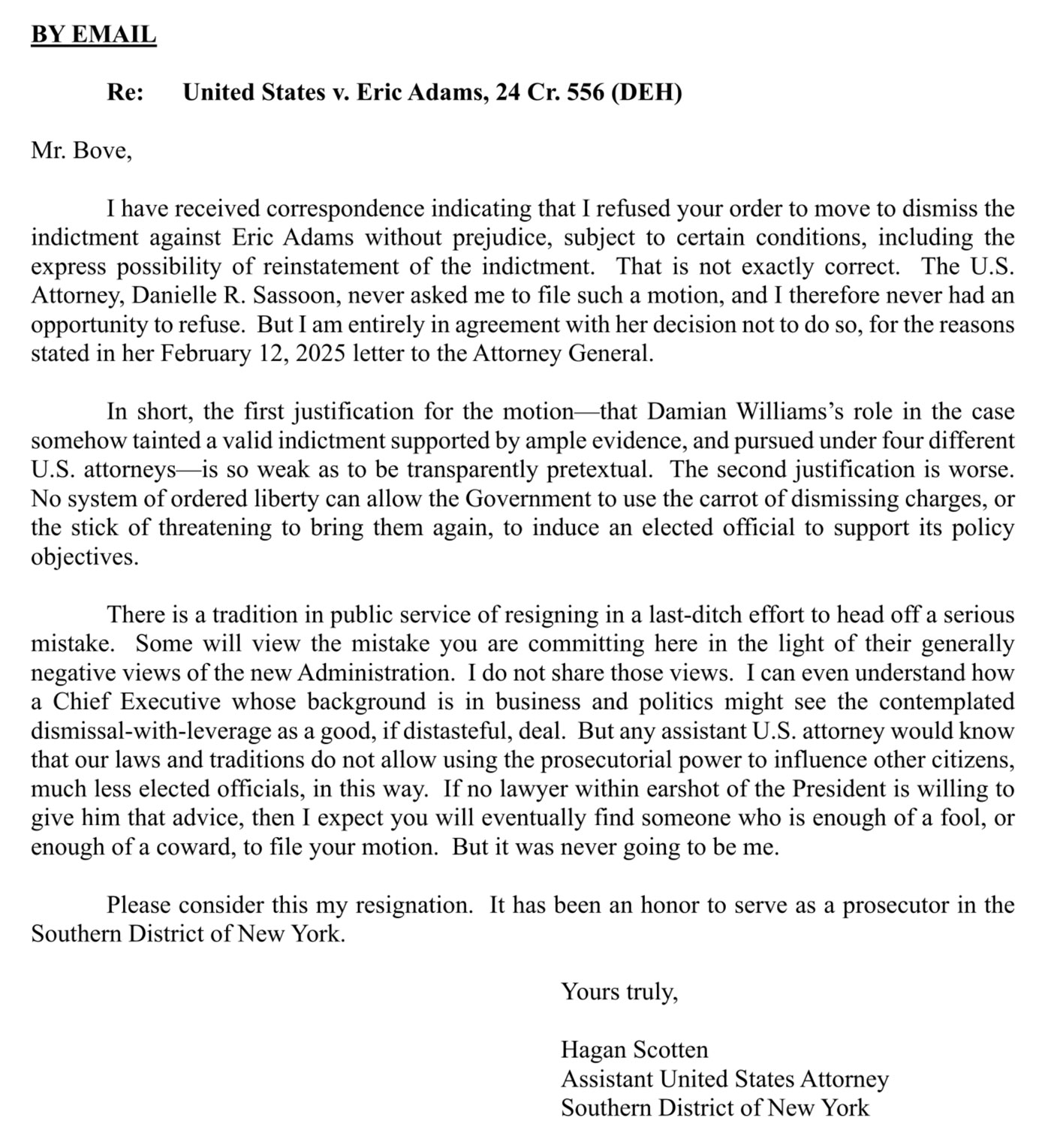 I have received correspondence indicating that I refused your order to move to dismiss the indictment against Eric Adams without prejudice, subject to certain conditions, including the express possibility of reinstatement of the indictment. That is not exactly correct. The U.S. Attorney, Danielle R. Sassoon, never asked me to file such a motion, and I therefore never had an opportunity to refuse. But I am entirely in agreement with her decision not to do so, forthe reasons stated in her February 12, 2025 letter to the Attorney General.