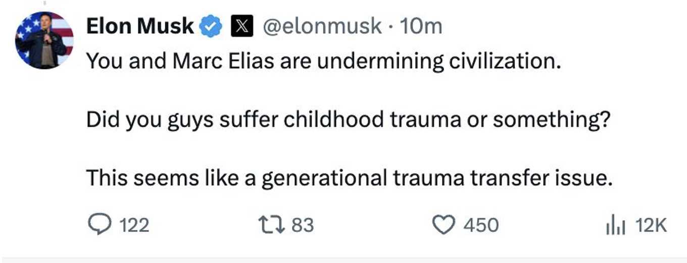 Elon Musk recently posted on his site that another lawyer and I are “undermining civilization.” He goes on to ask if we suffered childhood trauma and concludes by suggesting we are suffering from “generational trauma.” This is my response.