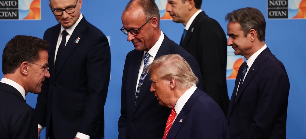 From left: NATO Secretary General Mark Rutte, Polish President Andrzej Duda, German Chancellor Friedrich Merz, President Donald Trump, Portuguese Prime Minister Luís Montenegro, and Greek Prime Minister Kyriakos Mitsotakis during the NATO summit in the Hague, Netherlands on June 25, 2025. (photo: Jakub Porzycki/NurPhoto/Getty Images)