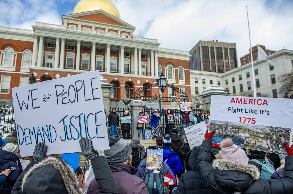 Demonstrators hold signs as they rally against President Trump and his policies outside the Massachusetts State House in Boston, on February 17, 2025.