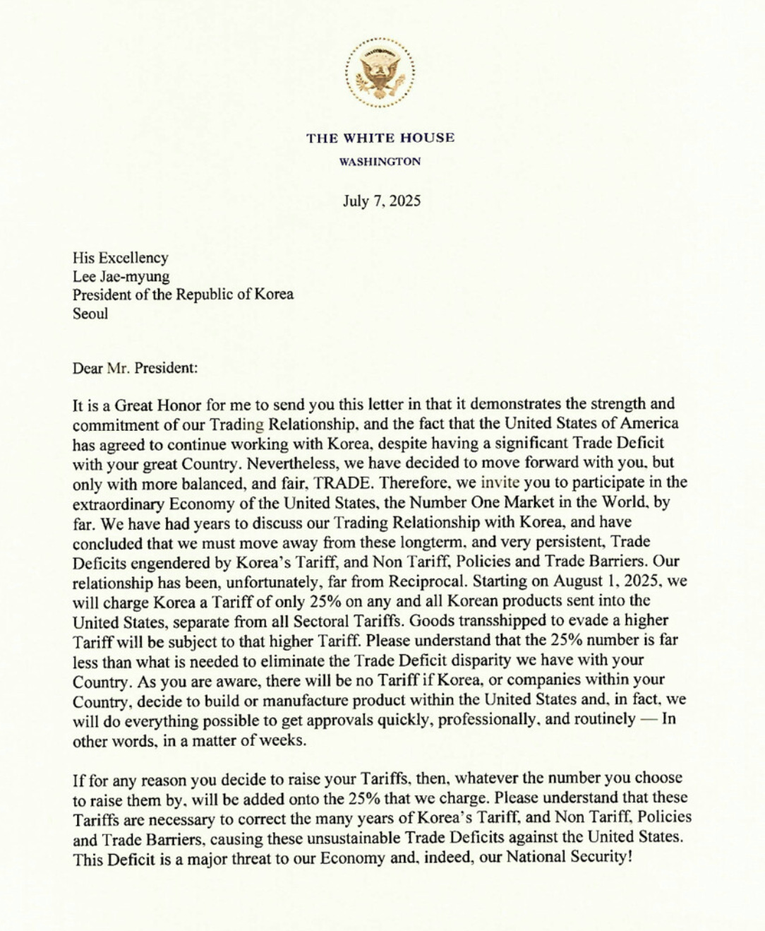 Here's part of Trump’s letter to South Korea, alleging that the country’s “Tariff, and Non Tariff, Policies and Trade Barriers” are responsible for the bilateral trade imbalance: