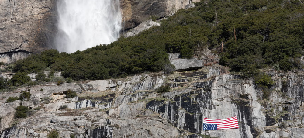 A US flag is hung upside down below the Upper Yosemite Falls during a protest against federal employee layoffs at Yosemite National Park, California on March 1, 2025. (photo: Getty) Rangers Hit Out at Trump’s Plans for National Parks: ‘They’re Going to Be Sold Off’