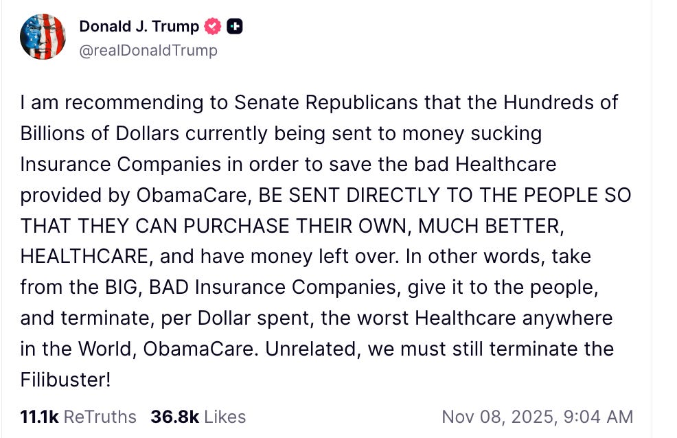 But the fact that Republicans have been misrepresenting how health insurance works since Obamacare was first proposed in 2009 is a testament to their cruelty and intentional ignorance. For example, Trump’s opening salvo against the Democrats demand for continuation of the ACA subsidies blasted “money sucking insurance companies”, claiming that the subsidies should be sent directly to taxpayers so that Americans can “PURCHASE THEIR OWN, MUCH BETTER HEALTHCARE” – that is, demanding that they pay doctors and hospitals out of pocket: