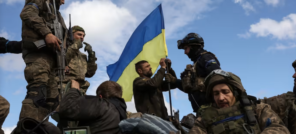 Ukrainian soldiers adjust a flag atop a personnel carrier on a road. (photo: Anatolii Stepanov/AFP) 'The Temptation Exists Among EU Member States to Abandon the Israeli-Palestinian Front in Favor of the War in Ukraine'