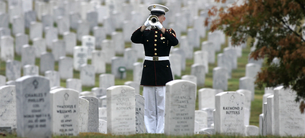 A bugler plays "Taps" during the group funeral of 12 servicemen who were missing in action from the Vietnam War at Arlington National Cemetery. (photo: Charles Dharapak/AP)