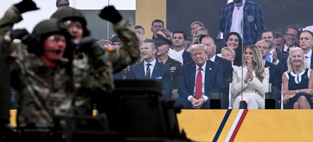President Donald Trump sits with Defense Secretary Pete Hegseth and first lady Melania Trump during a celebration of the Army’s 250th anniversary on June 14. (photo: Kenny Holston/NYT/Getty Images)