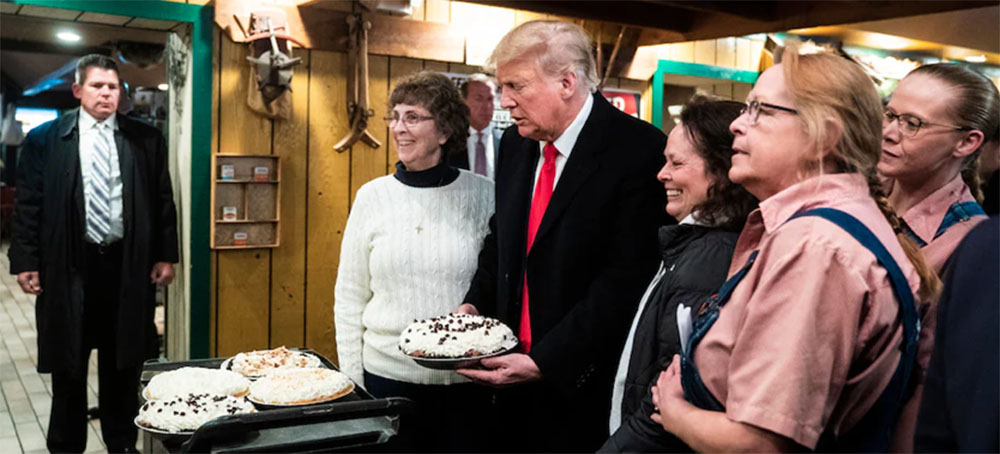 Former president Donald Trump holds a pie as he greets patrons at the Machine Shed restaurant on Monday in Davenport, Iowa. (photo: Jabin Botsford/WP)