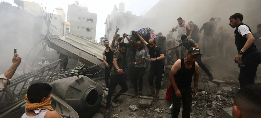 Palestinians remove a dead body from the rubble of a building after an Israeli airstrike Jebaliya refugee camp, Gaza Strip, Monday, Oct. 9, 2023. (photo: Ramez Mahmoud/AP)