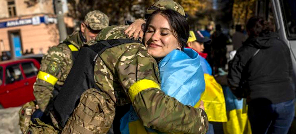 A Kherson resident hugs a Ukrainian defense force member in liberated Kherson, southern Ukraine, Monday, Nov. 14, 2022. (photo: Bernat Armangue/AP)